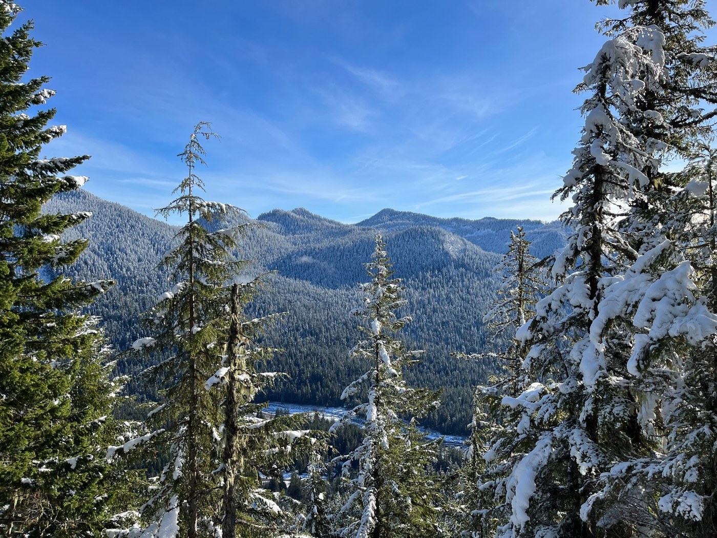 You'll turn right at this junction and head downhill on much steeper terrain than you came up (you might want trekking poles as well as snowshoes). It's 1.7 miles back down to the road and another 0.1 mile to the parking area.