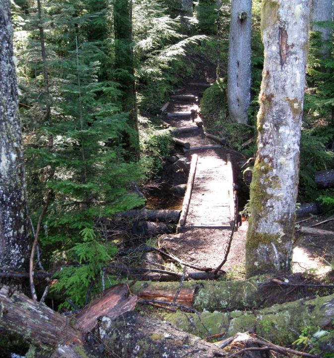 Eventually you will drop a little, cross Owen Creek on a bridge, then head gently uphill again. As you continue, the vegetation on the ground changes. It becomes a mat 3 or 4 inches thick that covers everything, even the trail. If your eyes haven't noticed it your feet will. The footing can be so wet that it feels like you are walking on thick, heavy-duty wet sponges. This is Sally's Swale. The term "swale" refers to a swampy area, and generally you would expect to find one in a low-lying area rather than here on a high ridge. But Sally's is different. It's a swale on a slope!