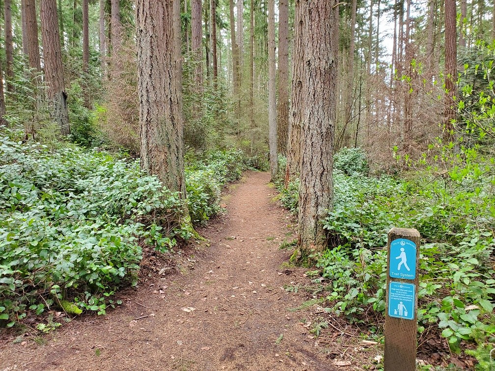 From the parking lot, walk south on the paved path past the dog park. After about 900 feet, under the canopy of Douglas firs, turn left onto the trail. You'll see City of Bellevue trail markers throughout the 10-acres of wooded area. The trails are wide and even with a slight slope to the east of the park. The flora of the park has common northwest varieties.