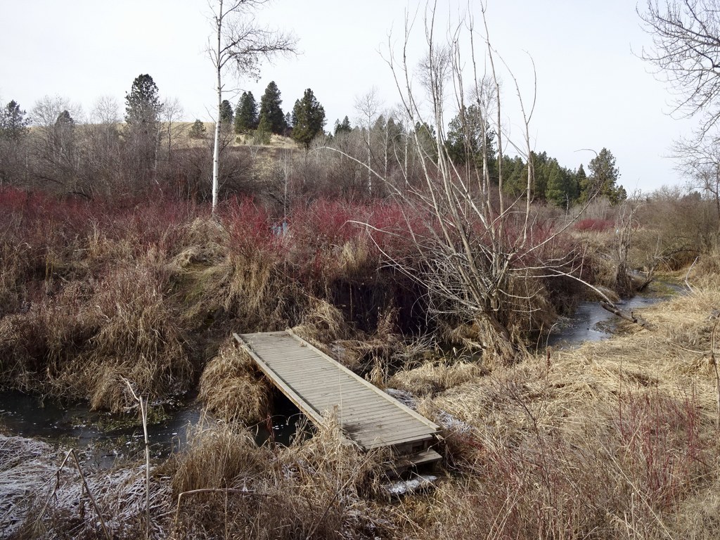 A trail winds along and over Rose Creek and onto the edge of wheat fields. This is no heart-pumping hike but a leisurely stroll though a unique bit of the Palouse.