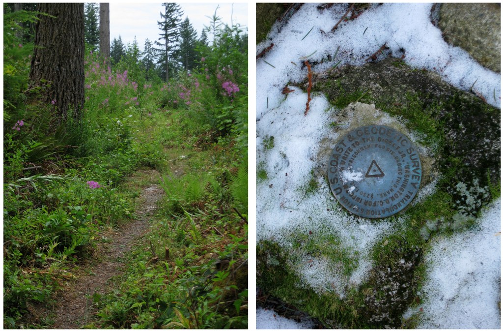 From the south summit, peer through the trees to the north and you can make out the contours of the north summit about a quarter mile away. It may be a few feet higher than the south summit and, because it was logged a few years ago, it offers the views you are denied on the south summit.