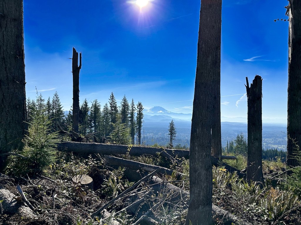 To start, follow the directions up the South Tiger Traverse Trail. The trail climbs through an area that was logged in years 2018 and 2019. You will see logging debris and young trees. About 2.5 miles in, shortly after crossing a logging road, reach the junction with the South Tiger Summit trail. Turn right here (turning left keeps you on the South Tiger Traverse Trail). In 0.3 mile, you will reach the south summit of South Tiger Mountain. Enjoy the views between trees and standing snags.