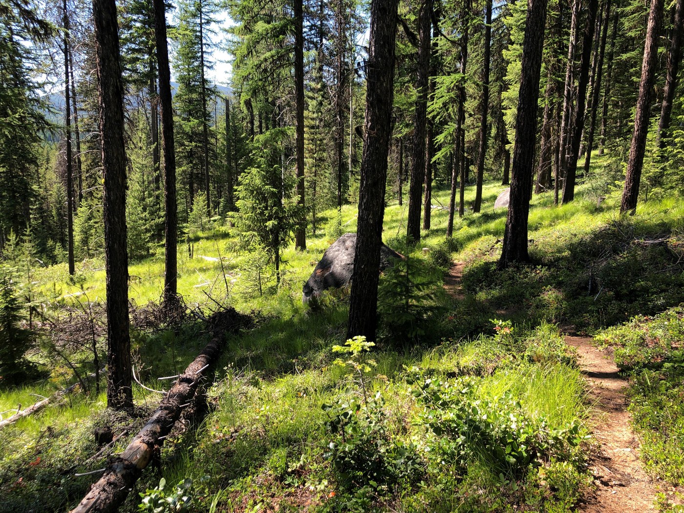 It’s a beautiful hike anyway, with wildflowers in the early summer and golden larches in the fall. A short walk from the trailhead brings you to a fork with a peeling sign. Turn left onto the Springboard Trail. After crossing a small stream on a footbridge you’ll reach another signed fork.