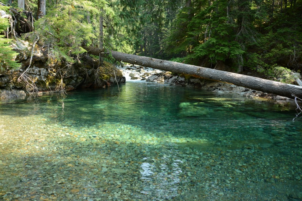 Continue following Chinook Creek downstream. At 0.8 miles from the junction, have your camera ready. A bridge crosses the creek where it pours out of a clear blue-green pool, and cascades through a rocky chute. At one mile, another beautiful pool is visible, with a crude side trail leading down to its shore. If you don’t mind sitting on the rocky shore, this is a delightful lunch spot.