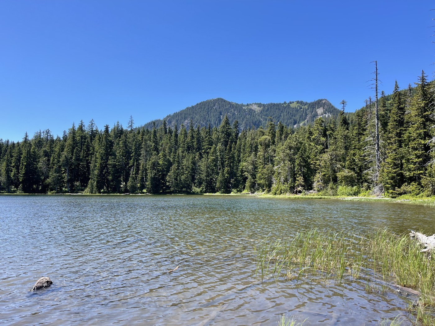 Just before you reach the lake, at a maximum altitude of 3586 feet, the overgrowth opens up, to announce your impending arrival. Follow the trail down to the banks of the lake, 1.2 miles from the trailhead, where Stirrup Creek dumps out. Dragonflies, damselflies, and water skimmers dart back-and-forth. Mosquitoes may bite. To the northwest, Meadow Mountain and its majestic reflection meet your gaze. You may have a close encounter with a hummingbird, but also know that elk and black bears wander through the area, drawn to the berried late summer treasure of this area.