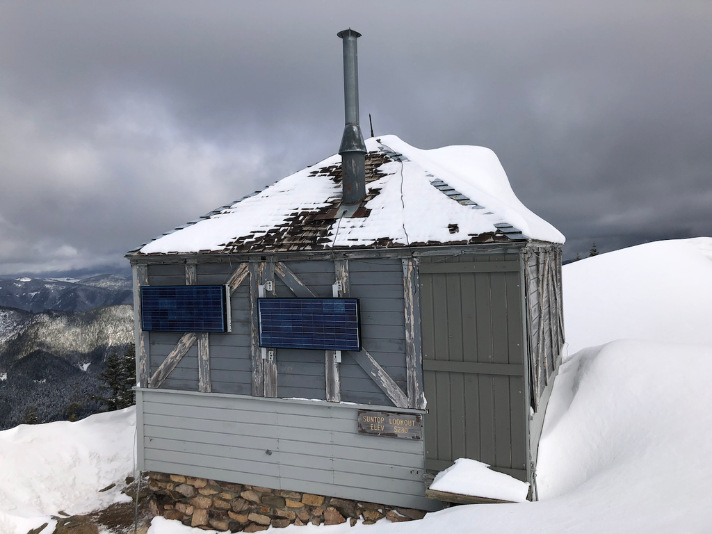 This snowshoe route follows a forest road, with a brief stint on the forested summer trail near the top, to a lookout building near Mount Rainier.