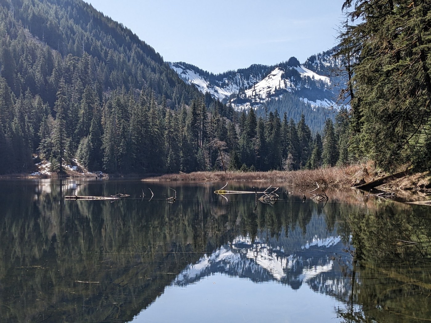 In late summer, the lower lake may become dry, revealing fallen tree trunks and the spot where Sunday Creek dives underground. At the upper part of the lake, take in the reflection of Goat Mountain as dragonflies zip past and you meditate upon your escape from the hiking multitudes of the Snoqualmie region.