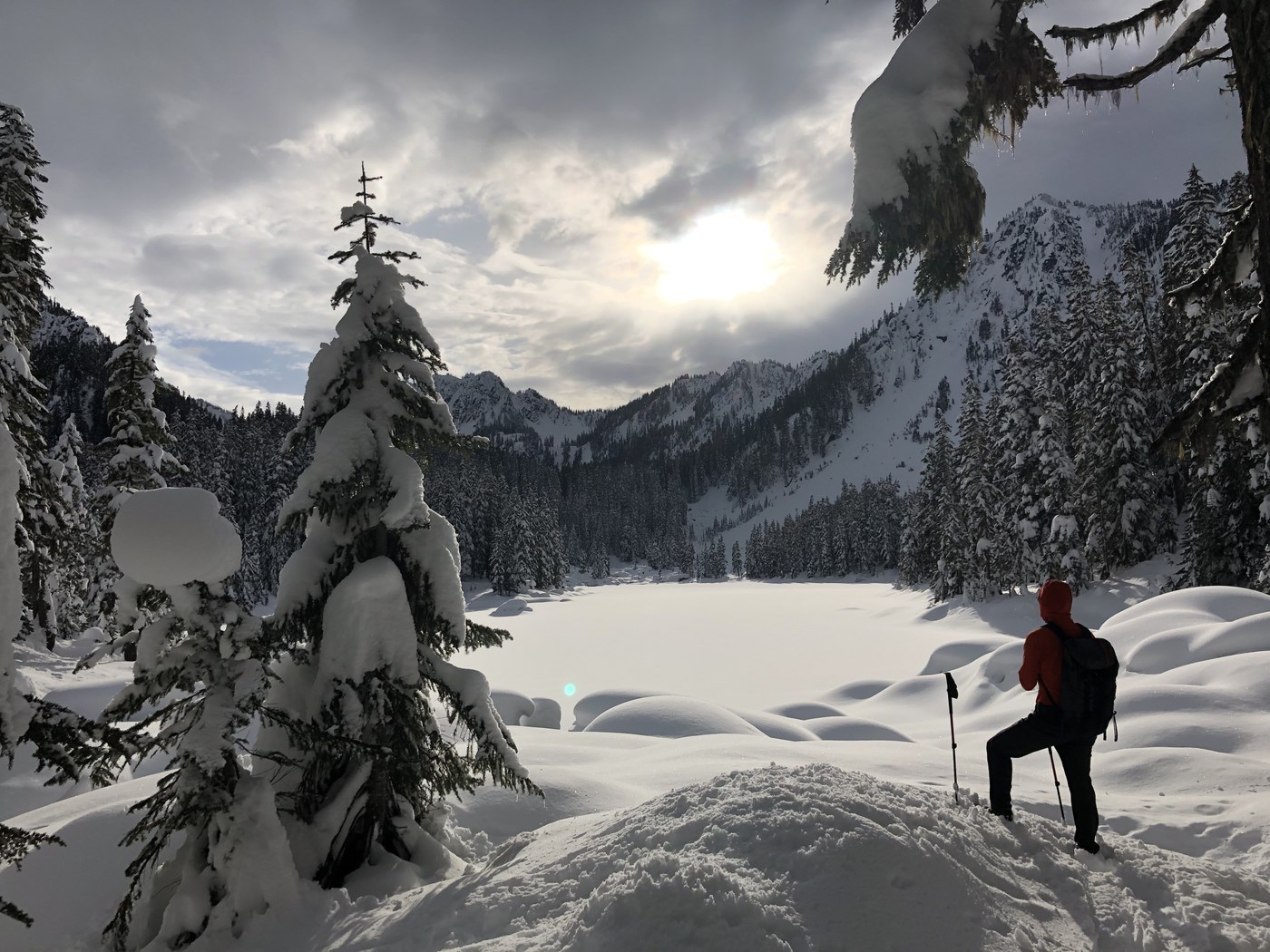 This backcountry snowshoe route does not follow any road or trail, but winds up the narrow Skykomish River Valley just over four miles to the banks of Surprise Lake. You'll get some views on the way to the lake, but the large lake opens up the best views of the trek.