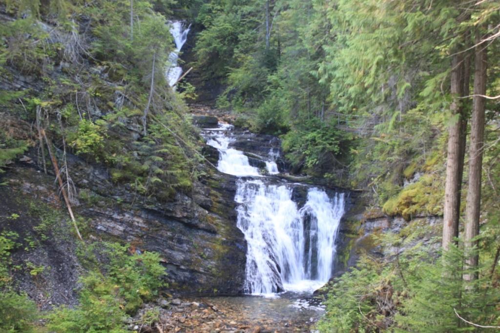From the south end of the parking lot, the lower trail crosses a footbridge, turns right, and leads downhill to a crystal-clear pool at the base of the falls where visitors can play on a hot day. This trail is well-maintained packed gravel.