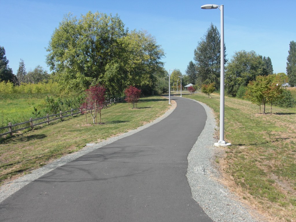 There are benches off the trail in the grass area facing the slough. The trail goes under I-5 to the west and shortly after that is the end of the trail. Gages Slough is to the south of the trail. Blackberry bushes line the trail, and in several places the picking is good.