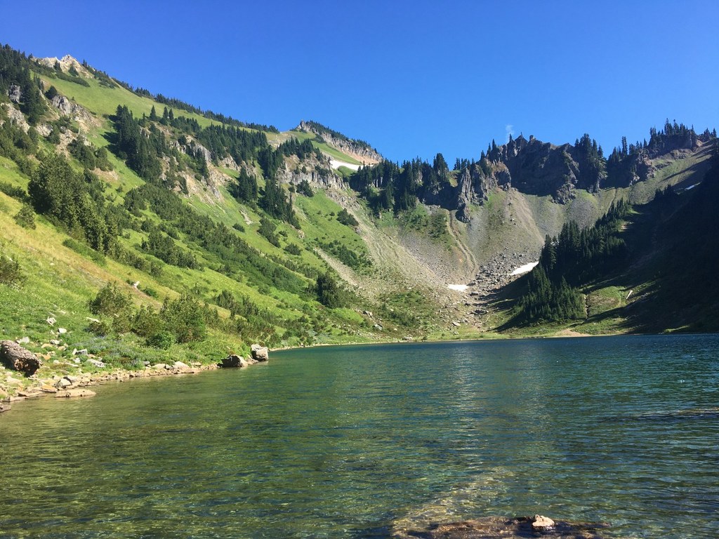 From the north trailhead for Tatoosh Trail 161, climb 2.5 miles to the signed junction with Tatoosh Lakes Trail 161B. The spur trail is open to hikers only; not even horses are allowed. Head uphill on the Lakes Trail, climbing 150 feet in an eighth of a mile, then cresting over the ridge to a different view of Mount Rainier. Drop steeply down on good trail. There is just one brief section with loose rocks underfoot. A short way down, a sign reads “No camping fire or stock”. Note that this is now true of the entire Lakes basin, not just where the sign is.