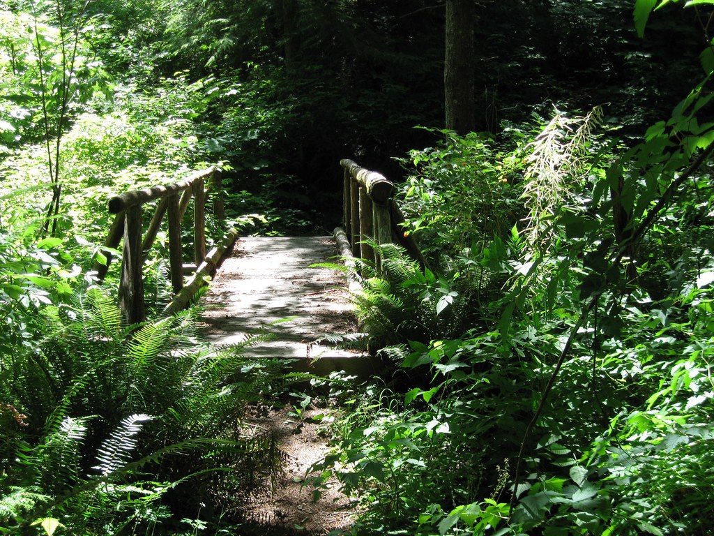 The bridge, located near the midpoint of the TMT, is a low, rustic structure crossing the head of Fifteen Mile Creek. In spring, look along the banks for skunk cabbage. In summer, when the vegetation is so thick you may have difficulty seeing down to the water, look for ripe salmon berries and a few wildflowers. Any time, spring through fall, the bridge is a pleasant stopping point. Sit a while, sip and snack, and relax to the soft sounds of the flowing stream.