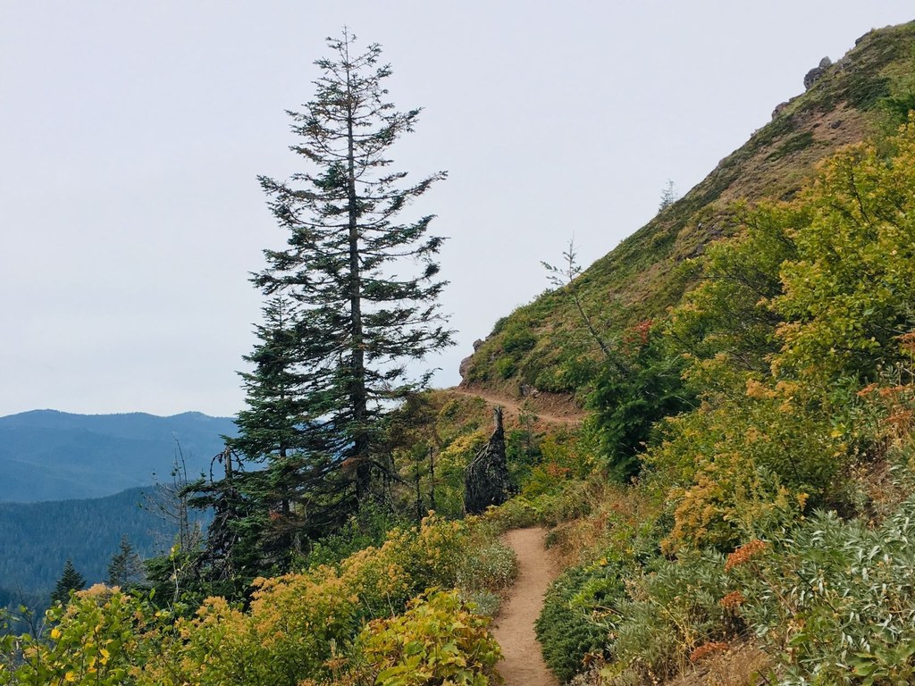 Pass the junction with the Mazama Trail (#625, previously the Cathedral Ridge Trail) and McNeil Point (#600M) at 18.3 and 18.6 miles respectively, being aware of signs for meadow restoration as you weave through the western hemlock and magenta heather.