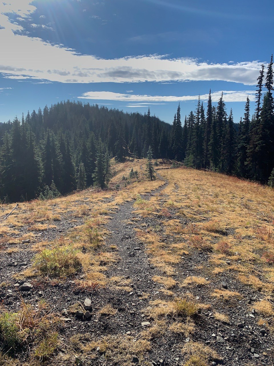 From the Pete Lake trailhead, hike a fairly flat and wide trail for 1.2 miles, crossing several creeks before arriving at the junctions for the Tired Creek trail off to the right.