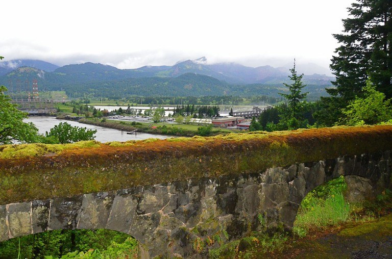 The first mile is along a restored section of the old Columbia River Highway, and feels a bit like walking on a freeway. Greenery and flowers decorate the way though, which makes it more pleasant. The old highway loops around Tooth Rock before arriving at Tooth Rock Viaduct. This impressive structure is thanks to Samuel Lancaster, the man who constructed the original historic highway.