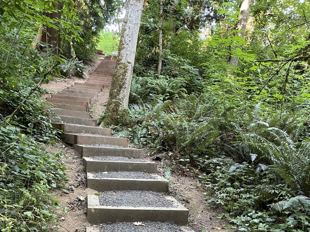 Trillium Park consists of a steep drainage with some large old-growth trees. The trail through the park is steep and has lots of stairs.
