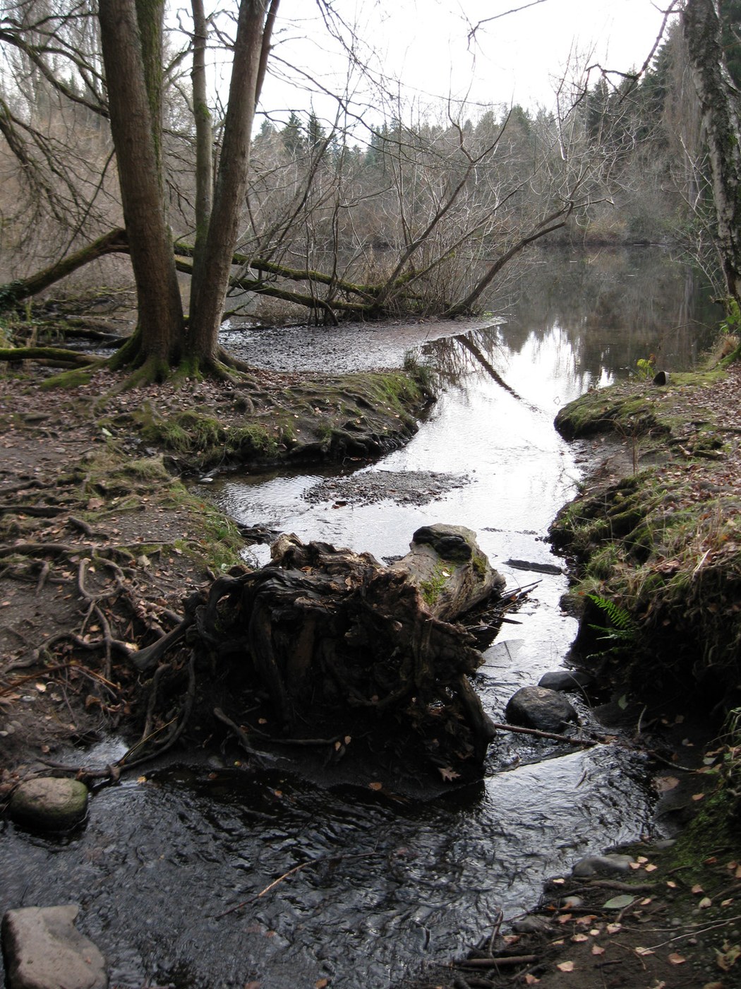 Cross the land bridge again, and this time head right (south) along the edge of the soccer field. When you are past the soccer field, head left and be alert for the large wooden bridge that crosses the outlet stream. This is Thornton Creek, which flows on into Lake Washington.