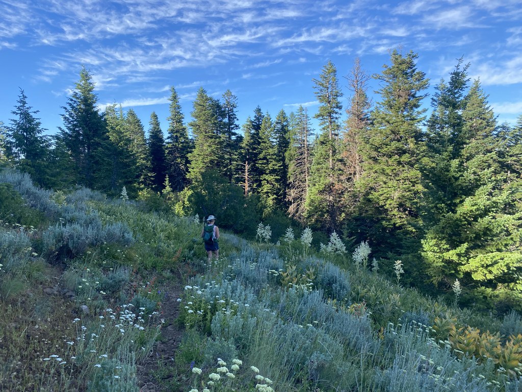 The eastern end of the trail is at the Horseshoe Prairie Trailhead, but there are many other access points, since the trail skirts several forest roads. One other popular trailhead is the Ninemile Trailhead. The trail follows the boundary of the North Fork Umatilla Wilderness on a circuitous path, running through several meadows along the way. It is open to hikers, bikers, and horseback riders, but if you cross the wilderness boundary, you must leave your bike behind.