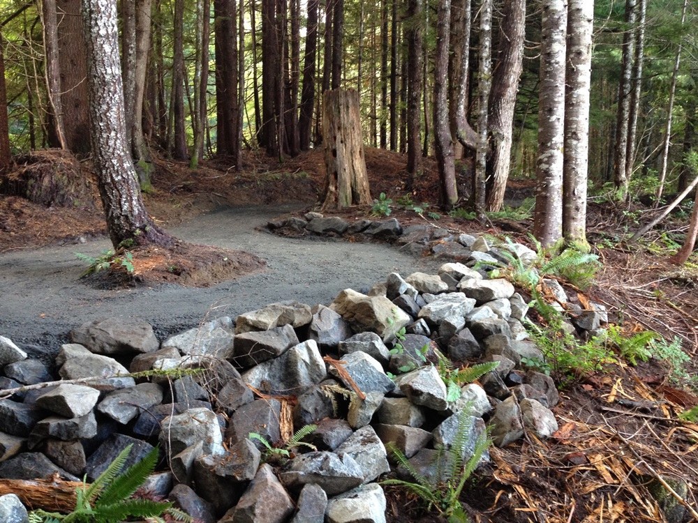 A thick green canopy of trees high above the trail shades hikers, keeping it considerably cooler on the hike, even when tempuratures soar in midsummer. The trail follows an old logging road, though it may be hard to tell. Trees have grown up over many sections of trail, and WTA volunteers worked hard to create a more natural experience for hikers as they built the trail over several years.