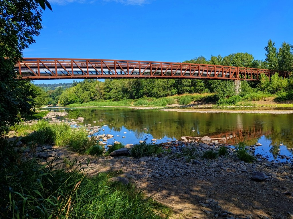 The highlight of the hike is the large arched footbridge spanning the Washougal River. Looking downriver, you can just glimpse the smokestacks at the paper mill. The trail also passes by three ponds (two at high water) that are former gravel quarries now managed as fish and wildlife habitats and crosses a seasonal wetland on a boardwalk. Benches along the way provide places to pause and enjoy the scenery and watch or listen for birds.