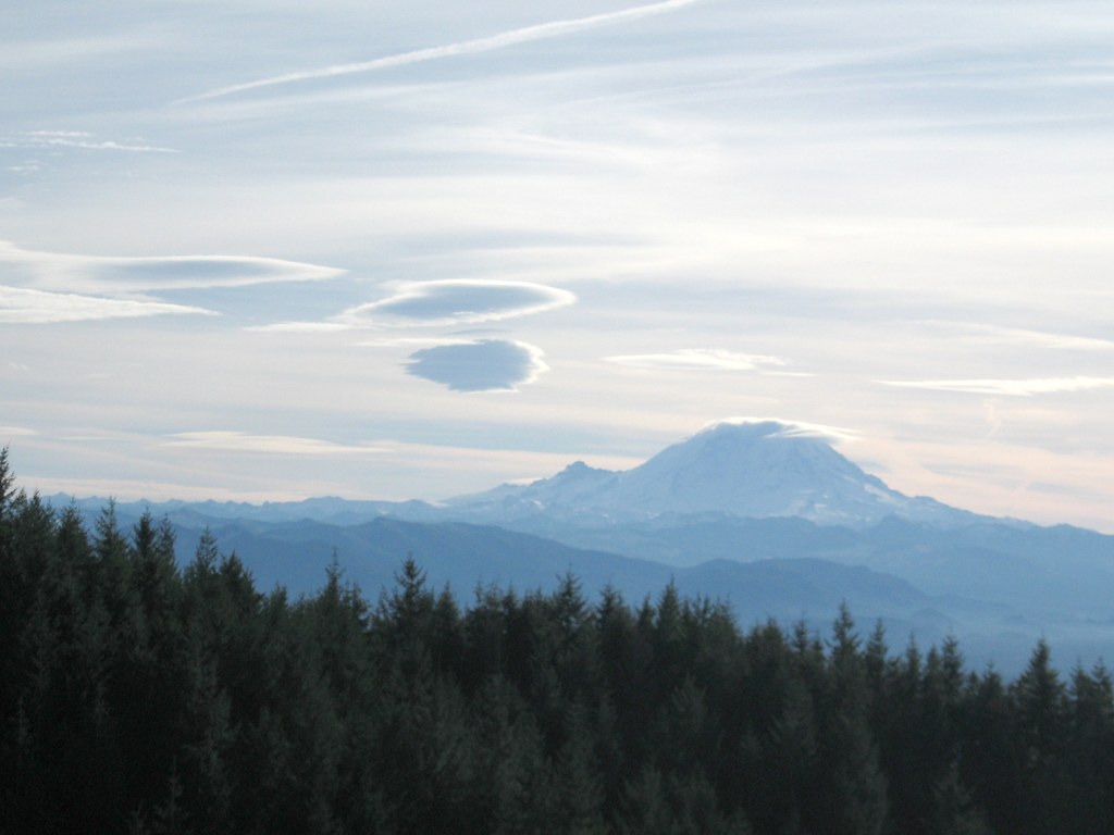 The hut itself is a small, round metal structure that might serve as a very basic storm shelter in winter. A graveled service road arrives here from the west to reach the electronics gear, and a bench is available across the road. Sit and take in the view. On a clear day, Mount Rainier will be directly in front of you and of a large swath of the Olympics will be visible to your right.
