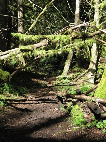 The forest along this section of trail is a marvel of greenery and mossy tree trunks, and it looks very old. It's all second growth, of course. And here and there a huge, weathered stump hints at the ancient forest that once covered these hills.