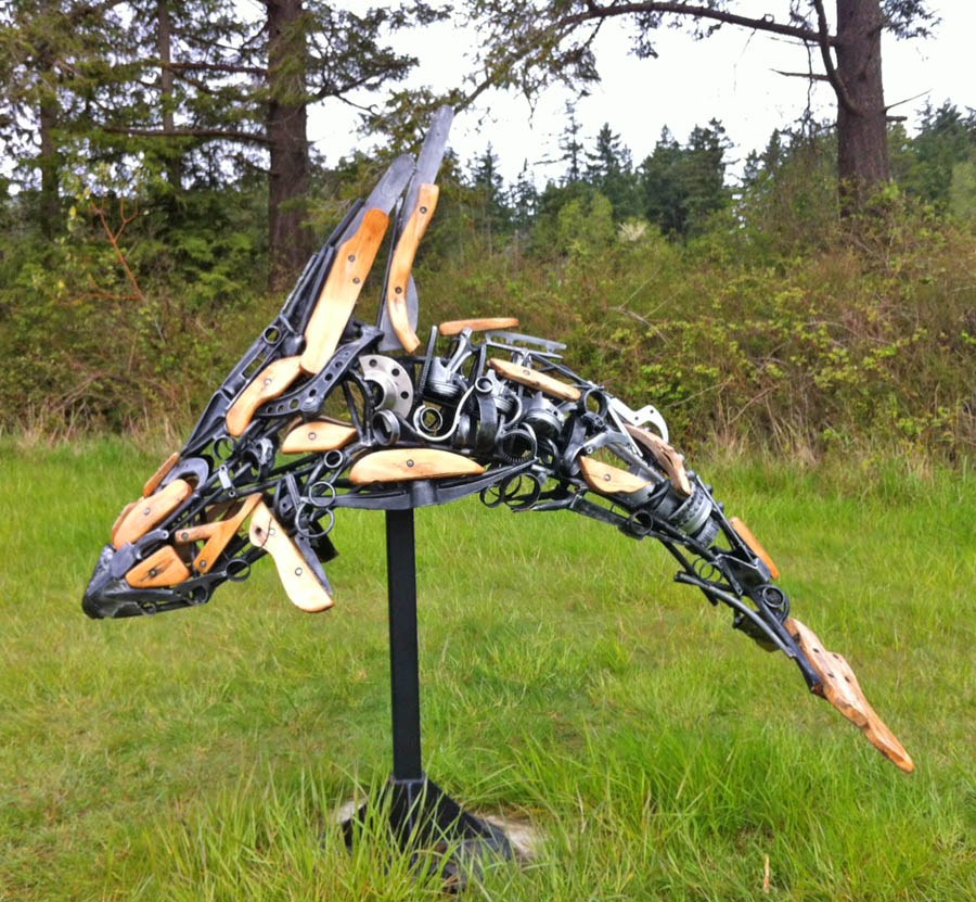 From the San Juan Island ferry dock, head into town and turn right on 2nd Street. This will curve into Guard Street. Go one block and take a right on Tucker Street. Tucker will become Roche Harbor Road - go for more than 8 miles. Just after the intersection with White Point Road, look for the sculpture garden and parking on the left. Park here.