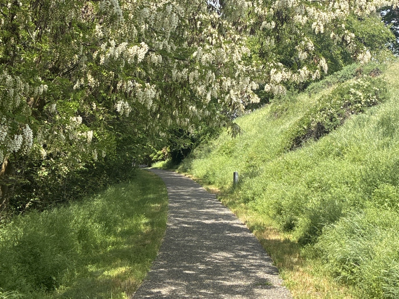 The mowed trails at Mill Creek depart from the far end of the parking lot near a large picnic shelter. One branch leads west along Mill Creek to Sweagle Road. The other branch winds east past some wetlands and ends at the paved trail at the Great Grave site.