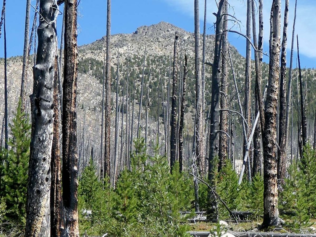 After the initial 0.2-mile climb, the trail shallows out to an average climb gradient of 150 feet/mile for 0.6 mile to the first crossing of Windy Creek. The crossing is a log walk in early summer and a rock hop in late summer. In places along the way, the young pines form a wall 10-15 feet tall on both sides of the trail. In other intensely burned areas, the silver forest is all that remains.