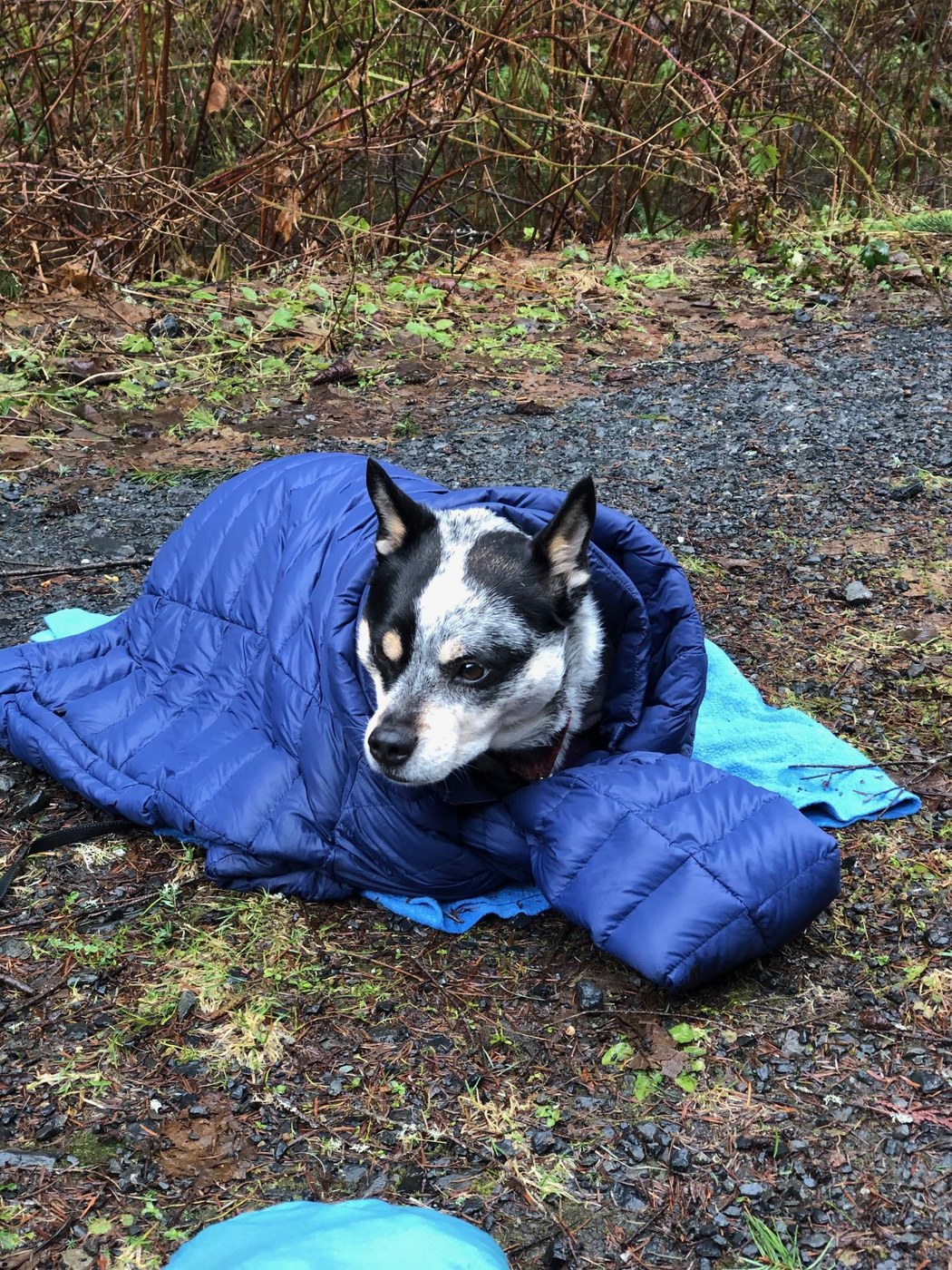 Second, he was cold when we stopped for lunch. His raincoat was not enough to keep him warm once we stopped walking and he got to wear my puffy while we took our lunch break. I'll need to get him warmer gear if we're going to be hiking in the cold and wet.