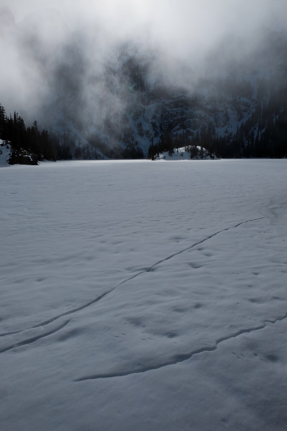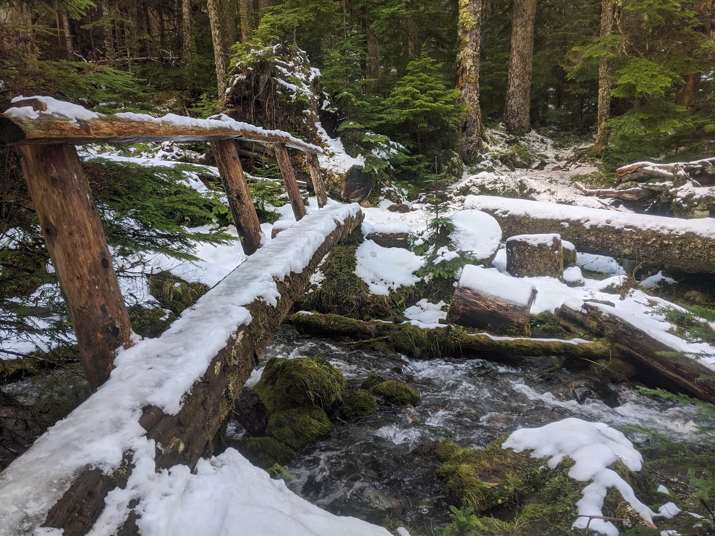 I started around 9:30 and made my way up the lush forested path. After a mile or so the trail started getting snowy. Be mindful of the icy log bride along the way! About 2/3 of the way to the lake I put on my microspikes to make it easier to finish the ascent to the lake in the slick snow. The snow was slippery but not deep.