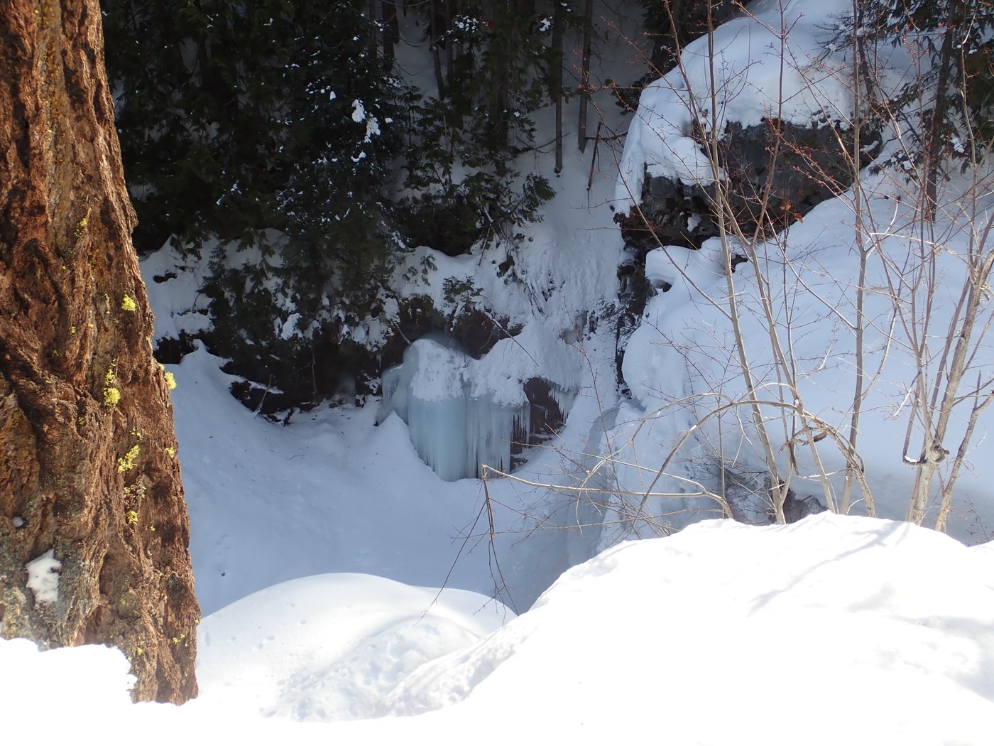 Quite easy to find the trailhead and follow the trail all the way to the falls. Looked like we were the first to travel on it since the 23 Feb storm but the trail was well compacted and quite obvious under the top layer of snow. In fact it was so well compacted I hiked the whole way, didn't use snowshoes (my strap had broken). Underneath the larger trees the snow was thin and a bit icy, but rough ice and not slippery. Some genuine powder just below the falls at 3400'.
