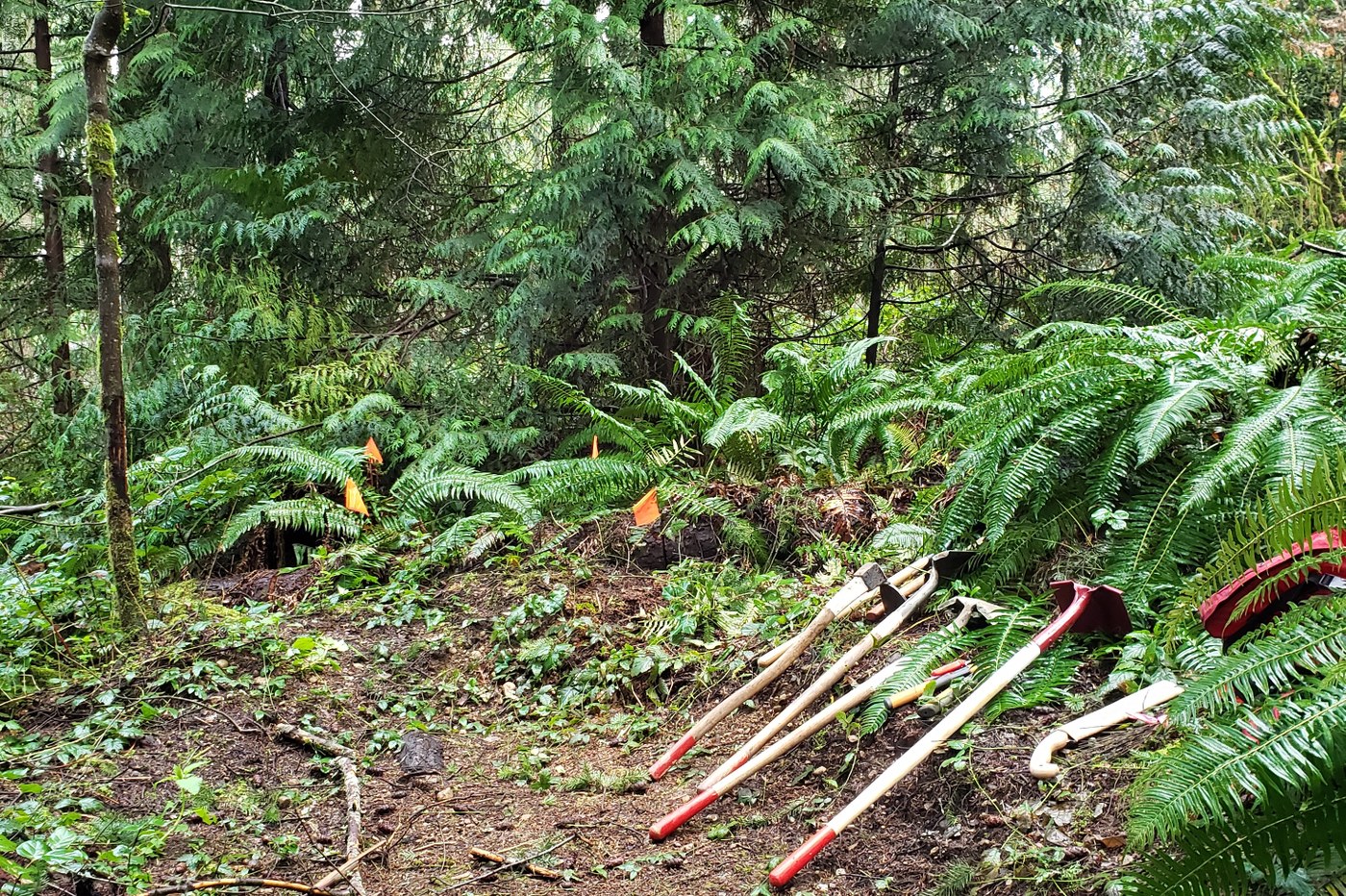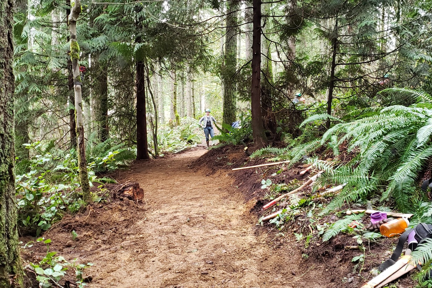 Our group worked on a new trail today. We cleared bush, grades the new trail, and added drainage. Downed trees were cut and removed. Others worked to improve existing trail. Quite a bit was accomplished.