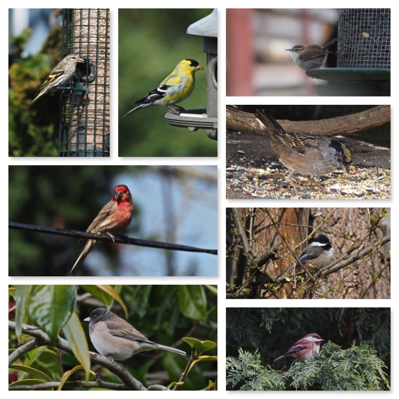 As I stepped outside today to check out our yard, many birds were enjoying the sunshine and our feeders! A golden-crowned sparrow was bathing in one of the bird baths. Pine siskins, goldfinches, a Bewick's wren, black-capped chickadees, a chestnut-backed chickadee, juncos and house finches were seen! The male goldfinches were beautiful and dressed in their breeding plumage! There were many blooming plants! One of our 10 rhododendron along the driveway has started to bloom! They are beautiful when blooming, but mean many hours of trail work as we begin "deheading" them after the bloom! In my walk I saw the need for many hours of maintenance to clean the flower beds before the weeds start to go to seed!