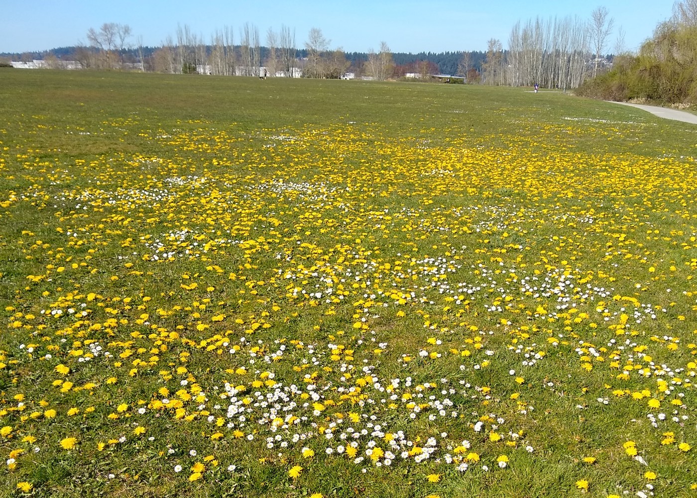 Decided to take my car for a short drive to make sure it still runs since I don't go anywhere anymore. Magnuson Park now has restricted parking. Only the first lot is open and the road through the park is closed. It was a bluebird day. I walked to the top of a hill and read the informational plaque. The wetlands below me were a runway back when the air force had a base here. The area is not at all as it was before the base went in, but it's great that it's becoming a wetland habitat. Flowers are in full swing. Yellow dandilions, white daisies, pink salmon berry, blue something-or-others. Along my 3.75 mile walk I saw a small duck with a glittery blue stripe on its head, a large bird with a black V-shaped collar sitting on a snag, and heard frogs croaking. Mt. Rainier was also out. I'm taking photos to remember this unusual time. Today's was of the picnic shelter cordoned off with yellow tape and Coronavirus warning signs standing in front. As I walked along today, I thought what I was experiencing-- the scents, the sounds, the beauty-- couldn't have been beat on any hike. My own neighborhood was satisfying my soul.