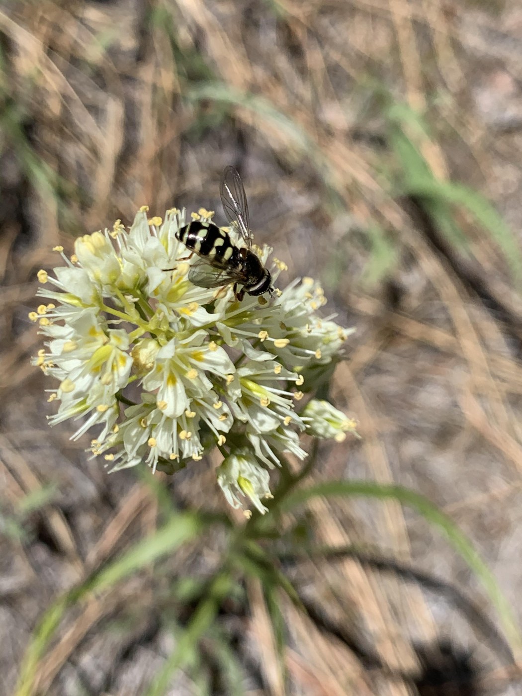 I crossed Pine Bluff road and headed out on (unmarked and unsigned) trail 25 around what would me mile 10 if it was properly marked. Two cyclists passed me near the trailhead. I crossed an open meadow liberally sprinkled with wild flowers below the power lines, before crossing Pine Bluff road again and starting up toward the bluff. In another mile I saw a couple with a leashed dog, a man with an unleashed dog and a rude couple of ladies who didn’t want to give me 6 feet of physical distance. Nobody else had masks. Wild flowers were blooming in great abundance as I headed uphill. At the bench at the top of the bluff, I sat for a while to enjoy the view and a snack while talking to a cyclist who was resting near the edge.