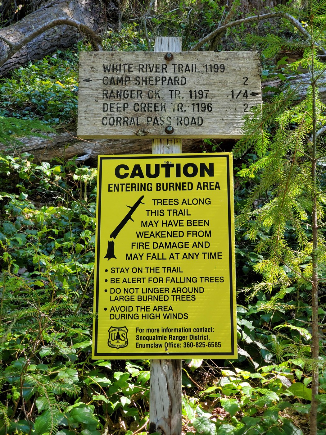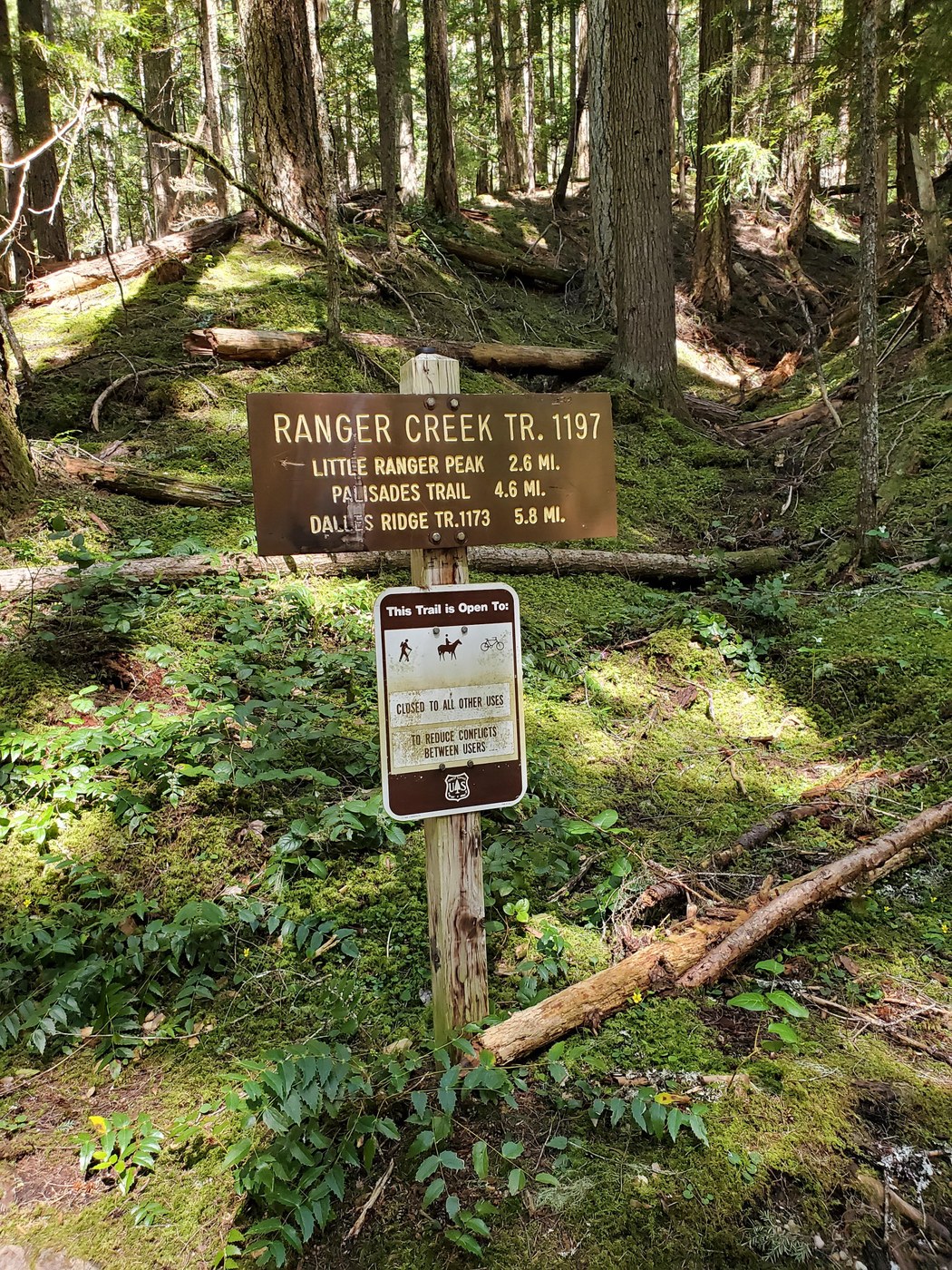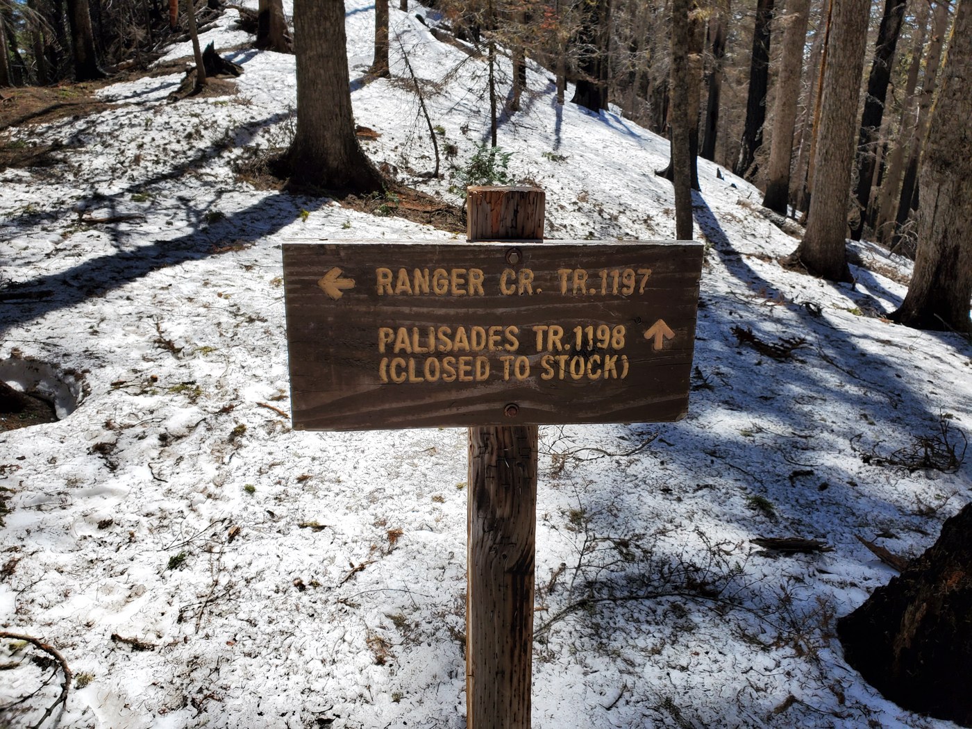 Did this hike 5/08. Parked along 410 with 1 other car and hopped on a spur trail up to White River trail and 0.25 to the trailhead. Only saw 3 mt bikers and one couple on this trip. Easy hike with good tread and a gentle slope. Ranger Creek could be heard for the first couple miles then you head away. Around 3.6 miles you start to see fire damage and then the snow started to cover the trail intermittently - deep at times, but likely minimal by the time you read this. It started out as a warm sunny day, but the cold persistent winds forced me to put on long sleeves - which I rarely do. Got to the junction with Palisades at 4.8 from the car and found a dry sunny spot amongst the snow and had lunch. Maybe another 0.4 miles to Dalles Ridge Trail. Got back to the car and there were 5 more cars and a few mt bikers in the non-descript parking area.