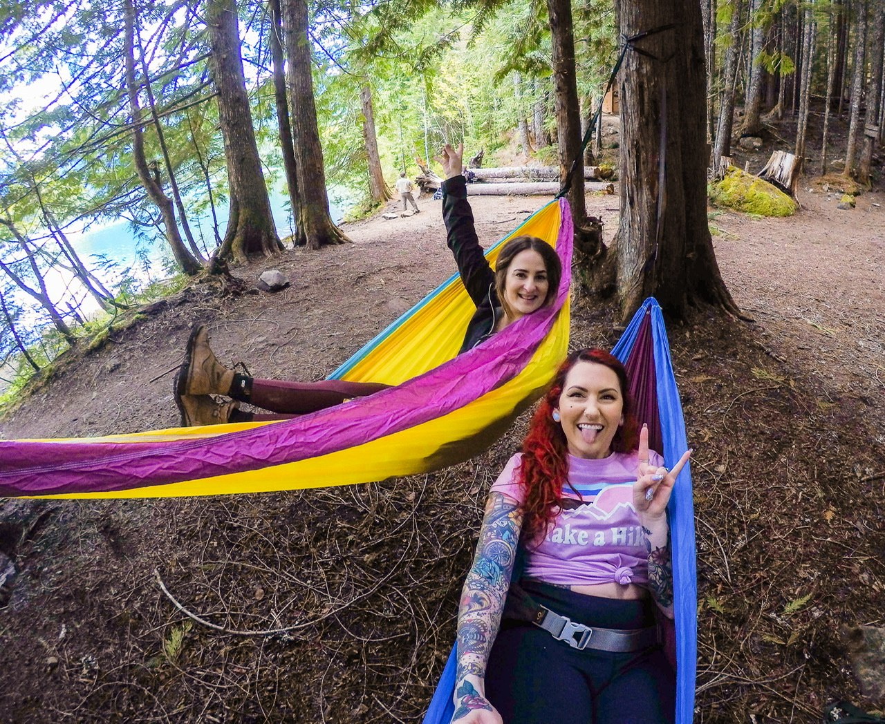 We explored around and walked passed the bridge with the stunning teal river. We set up our hammocks and at some lunch. Beautiful place to just relax. We left the lake at 2:18 and arrived back at the car at 4pm. On the hike back out we saw Rainier through the trees.