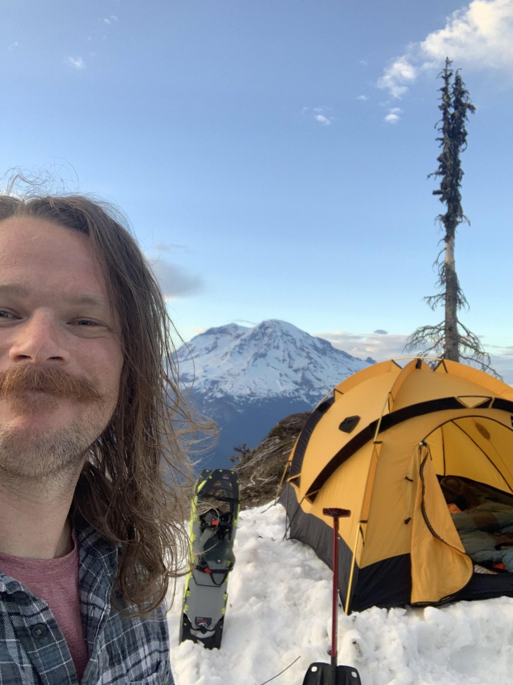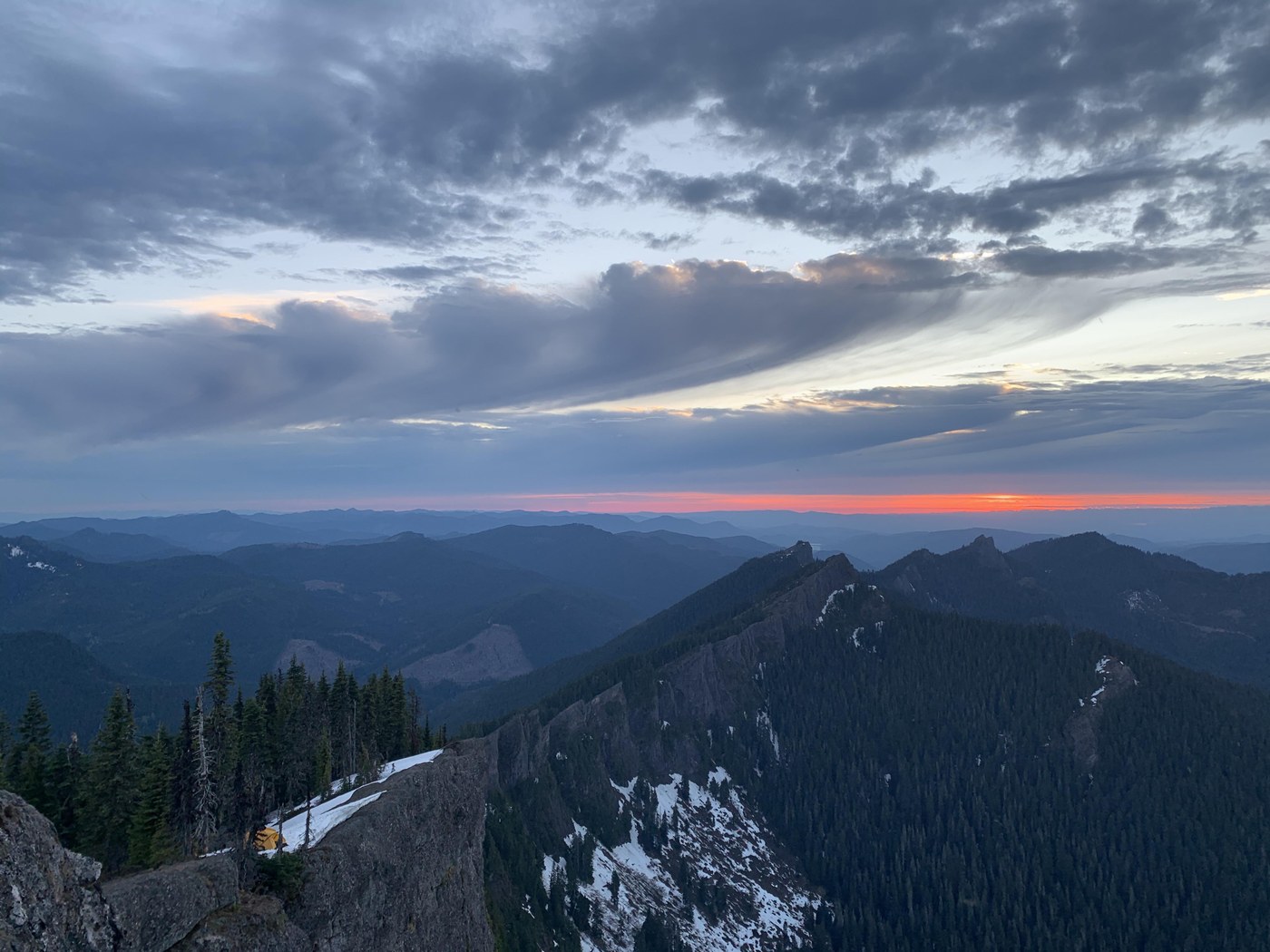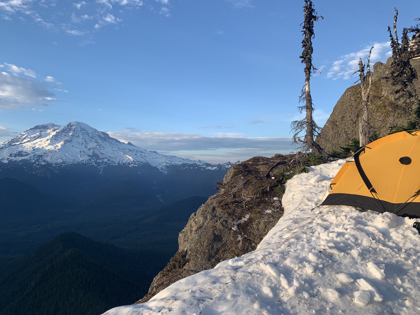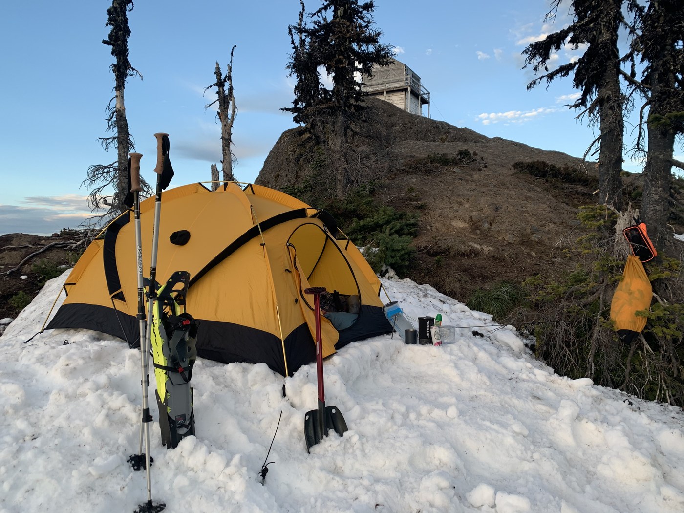 Shoveled a level pad and set the tent up on the ledge just left the lookout to be set up for the best sunset and sunrise one can ask for. I did the climb in waterproof boots, gaiters and microspikes. Brought snowshoes but they were not needed. Slept right on the ledge and glad I decided not to toss and turn in my sleep lol . Hike on !