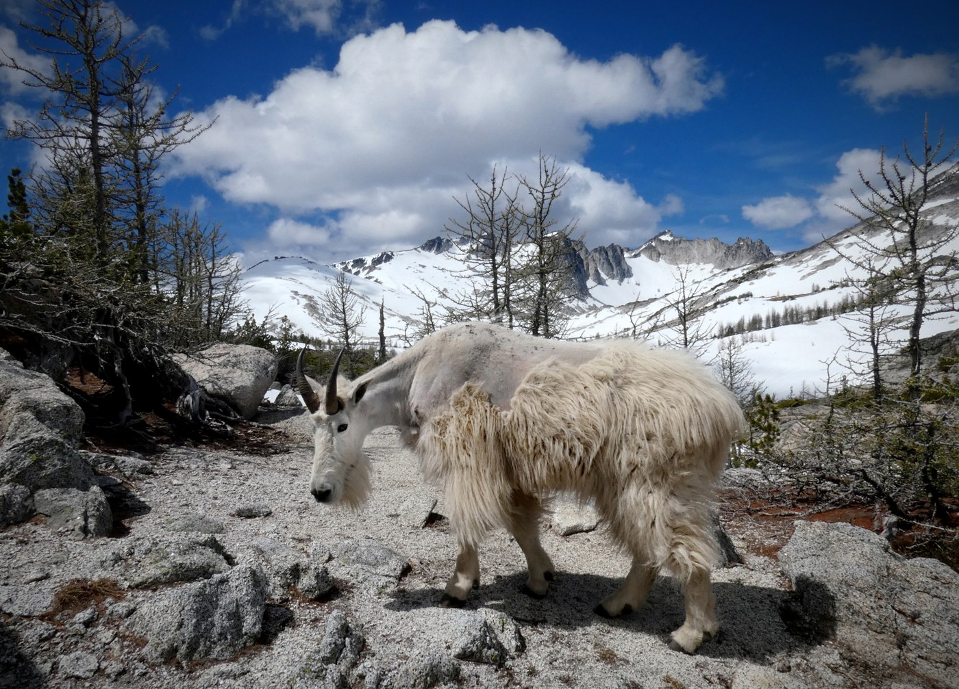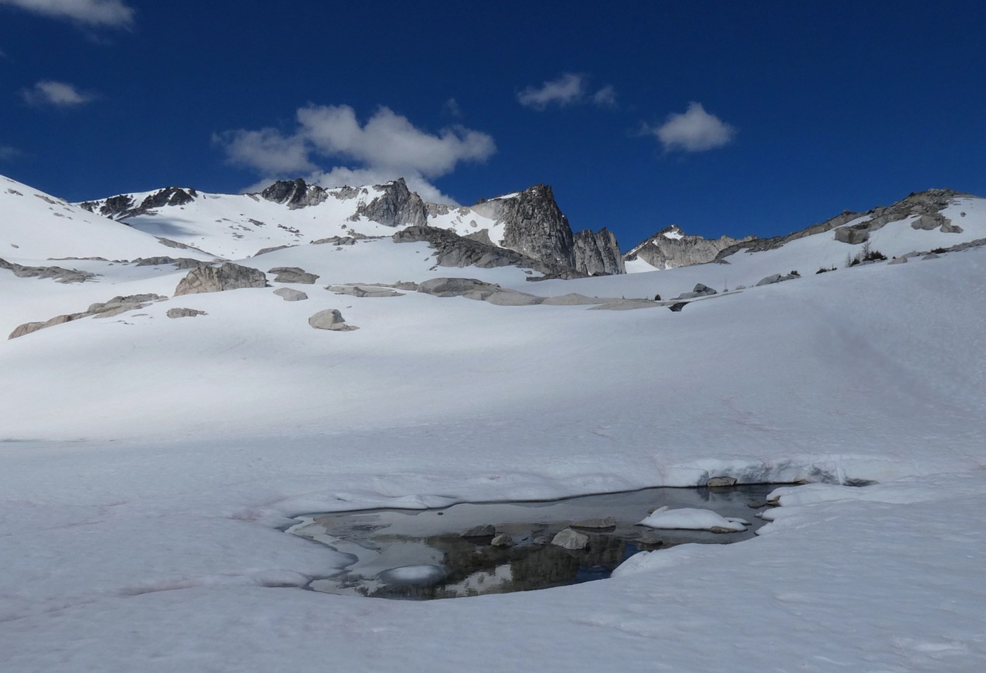 Once you come over the pass there is approximately 80% snow cover heading into the core zone. Lakes are still snow covered. The abundance of snow can make it difficult to find a good, flat campsite unless you're OK with camping on snow.