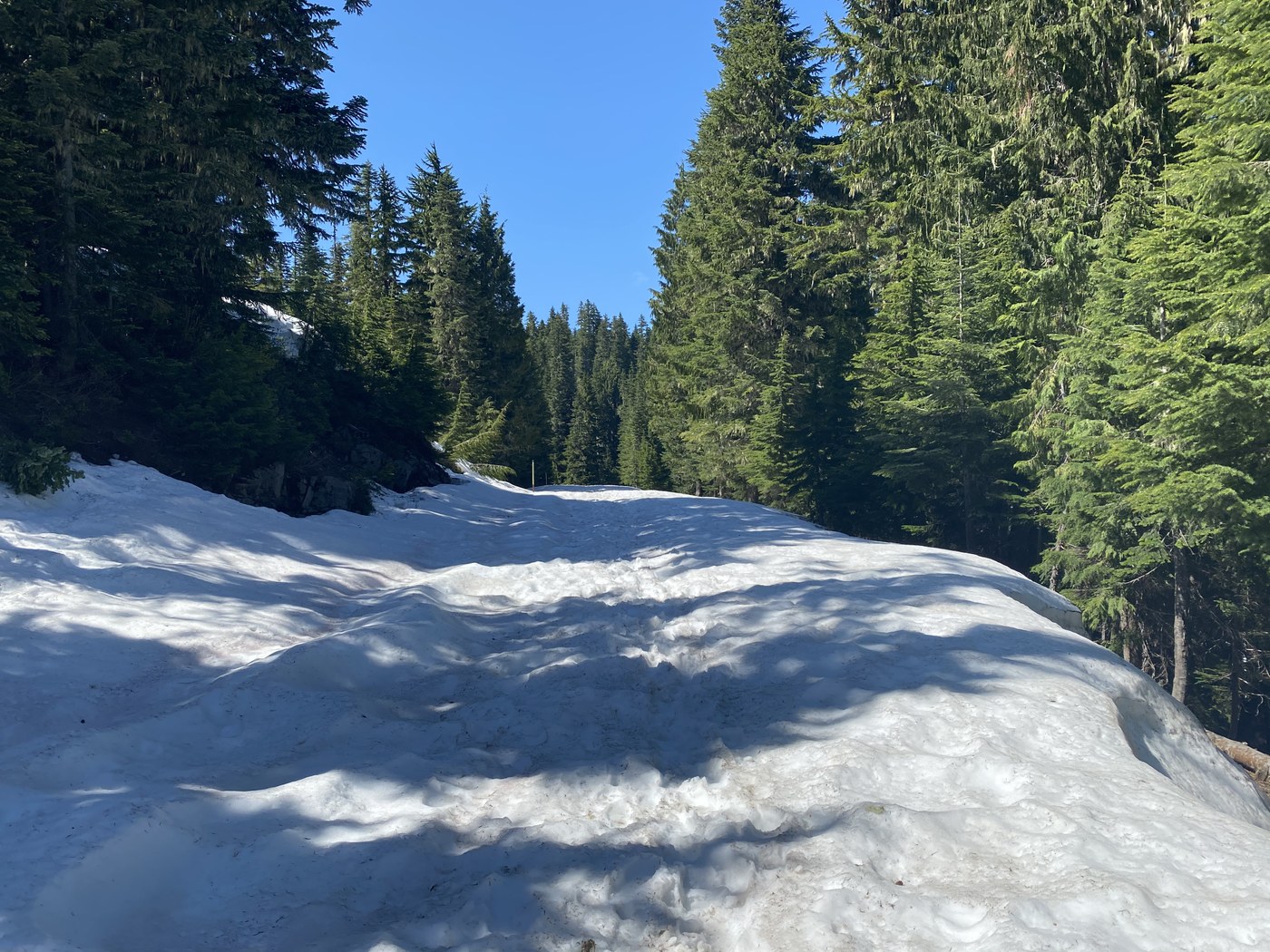 Was a little ambivalent about trying to loop up to the lake or just go back the way I came. I am a sucker for a loop hike so chose the latter, thinking even though it was longer it would be an easy last five miles of downhill road I could run. The right choice in not to do the loop unless you want adventure, challenge and about 3 plus miles of exhausting travel over still deep spring condition snow. Snow started about 2.25 miles up from the intersection with Paul Peak trail. This was about 4600 ft. Went from no snow to consistent rapidly on approaching the crossing of Crater creek. I grabbed a stick I found and used it as a hiking pole to help in the snow. Crater Creek is massive, there are two log bridges to cross but the trail between is free flowing creek, not dangerous to cross but plan on wet feet that will have to plunge back into hiking in snow once you get across. Little break in snow for few hundred feet but it got consistent again as it approached the intersection with Spray Park trail. Could see the sign at the intersection but the last 1/4 mile from there to the campground was the deepest snow yet. When I emerged victoriously at the campground I found 4-6 feet of snow, could barely see the lake as it is mostly snow covered (at least from the vantage from the road) and didn’t explore much because I realized there would be no easy road running anytime soon. Road was entirely snow covered 3-4 feet until 2 miles down. I figured out a way to kind of slide jog once it was a little firmer and downhill past the lake but it used a lot of energy. Would imagine it is a ton of work hiking up. Breaks in the snow after that but still quite a lot, didn’t really get clear road to run on till 2.5 miles down and at an elevation below 4500 ft. Rest of run on road was easy and road was in great shape. Really neat day, none of the snow dangerous to cross just worried I was going to tire out. Overall took a little less than 5 hours, will link the route on Strava below. Nice reminder about how late summer comes to the high country up here, can’t wait to return later this year when winter is really gone.