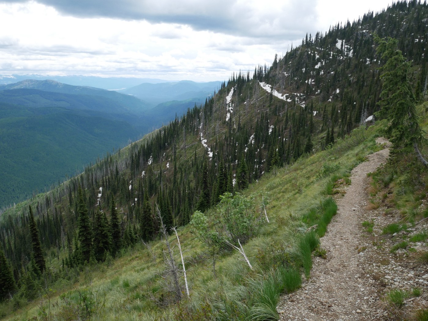 I decided to do the loop clockwise. I almost started at the wrong trailhead - to go clockwise, the trailhead is actually behind the first sign. The trailhead lined with boulders behind the second sign goes counterclockwise. Anyways, down to the river, the trail was clear. To cross the river, I went downstream a little ways to a logjam. There was maybe 4-5 trees down across the trail between the river and the ID border. The side trail down to the cabin is marked by a sign that just says Salmo River. There was a bunch of trees down on it, and I decided it was not worthwhile. Past the ID border, there was a lot more trees down, but nothing terrible. There was a always a log I could use to cross the river. The ascent to Snowy Top Pass was a mess of snow melt. Wear appropriate footwear, or be ok with wet feet!