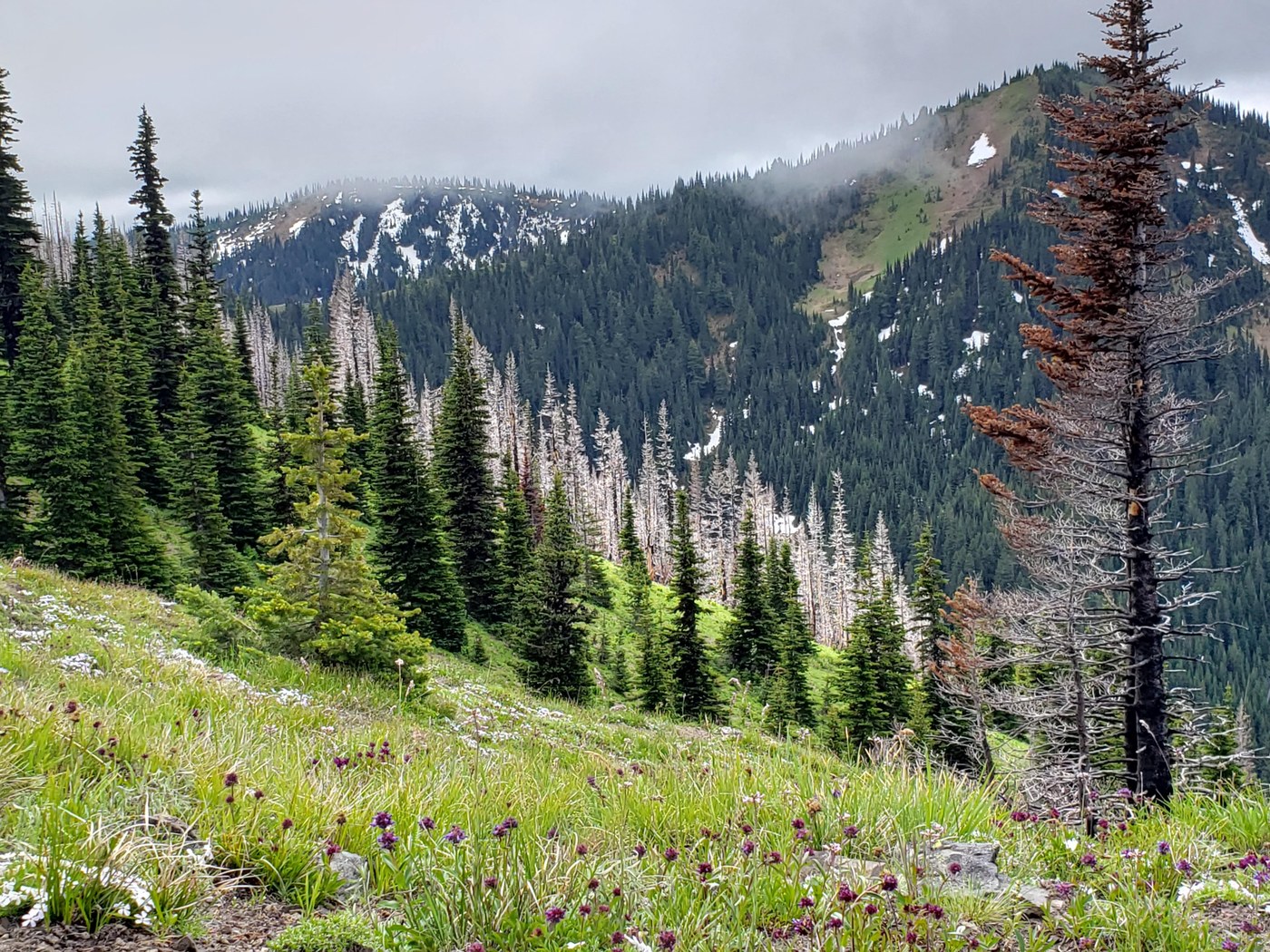 Flowers: There are many fields of yellow (snow buttercups mainly and glacier lilies) north of Scout Pass that can be seen from the trail and on the trail. Phlox colors the hillsides in many areas. A great variety of flowers and a lot more to come. A partial list, there is a google photo album attached with many flower photos: wild strawberries lupine, yellow violet, Jacob's ladder, foam flower, red Columbine, paintbrush (red, Thompson's, and magenta), thistle, bunchberry, Oregon anemone, trillium, bluebells, spring beauties, phlox, hellebore, purple violets, parsnip, ballhead waterleaf, snow buttercups, glacier lilies, littleflower penstemon, western wallflower (or prairie rocket :-), white marsh marigold, white globeflower larkspur, western anemone, buckwheat, fleabane, stonecrop, and many, many more.