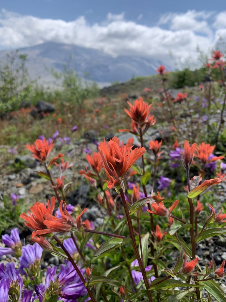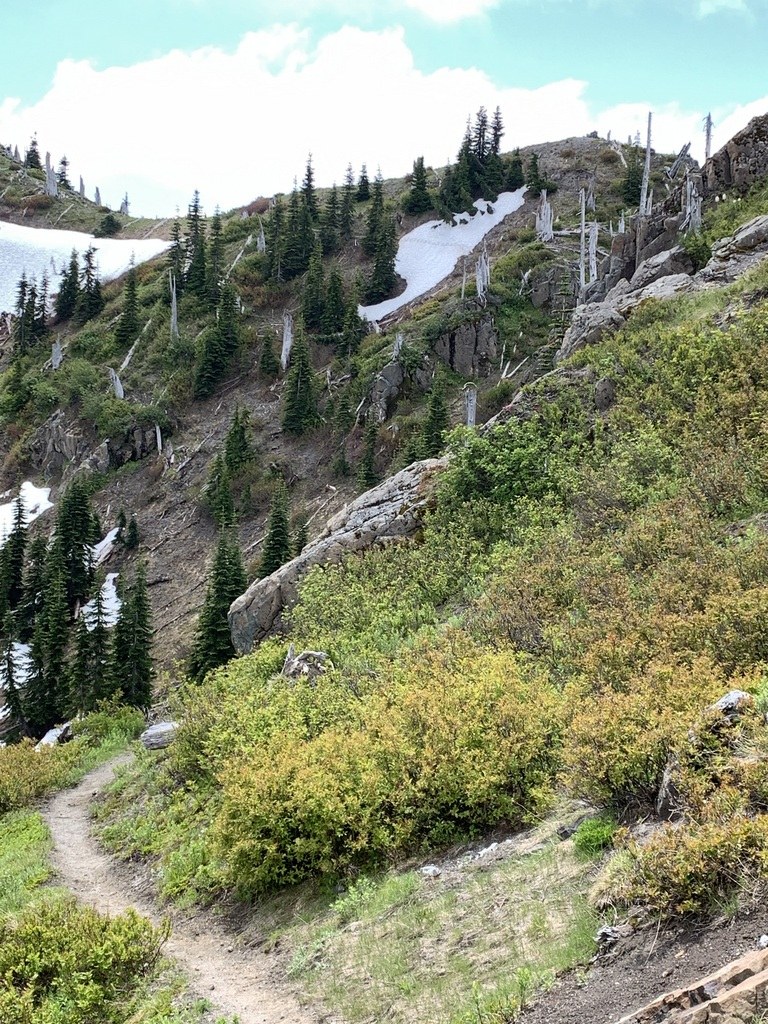 Lots of flowers are in bloom, and the paintbrush are near peak. There are a couple small snow patches along the trail between the first views of St Helens Lake and Coldwater Peak. One short patch is on a steep slope; there's a decent boot path, but a misstep here would not be good. I was glad to have my poles. I've included a photo of it.