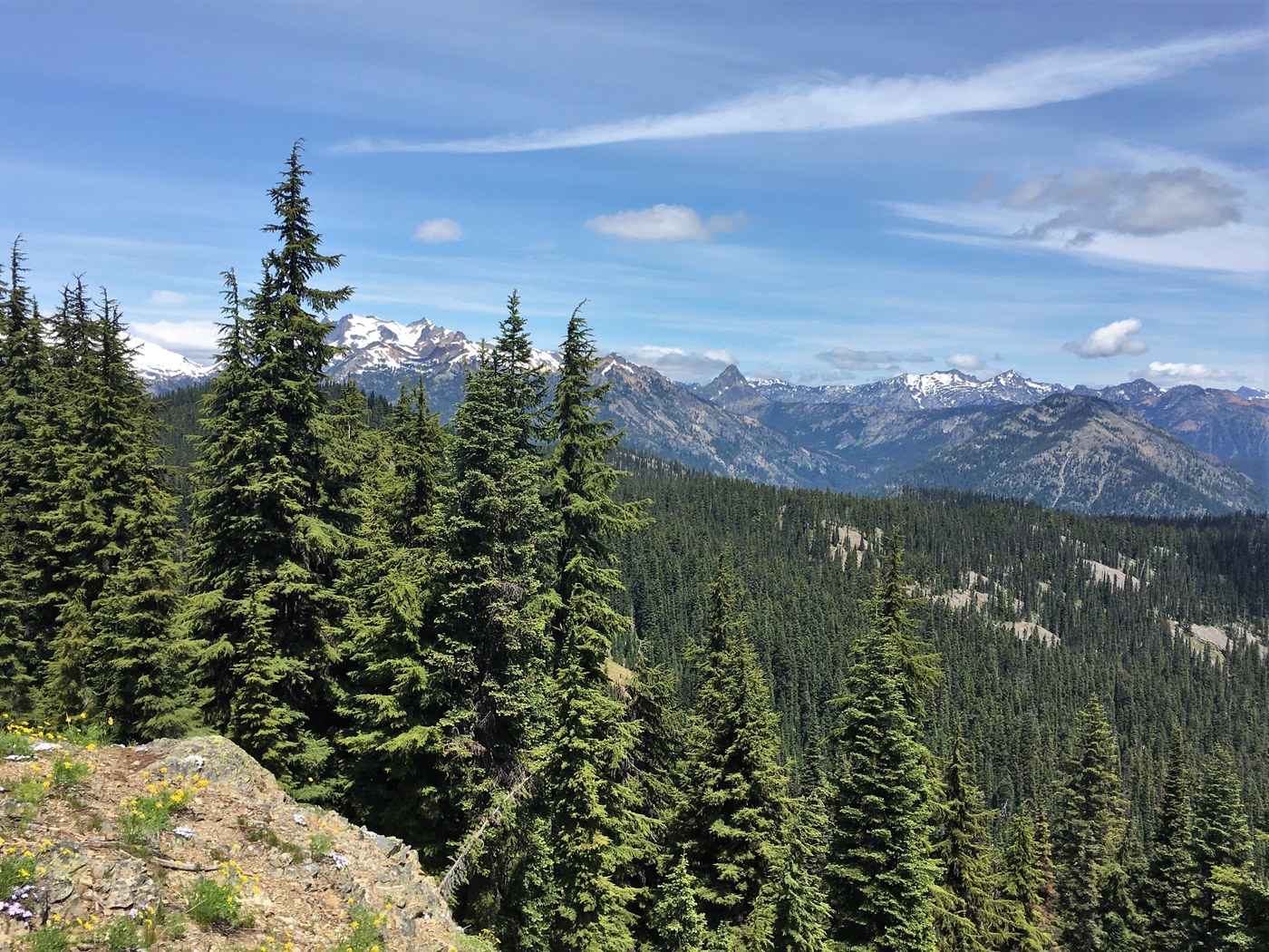 Got started at 8:55 am from the Pete Lake trailhead. In 1.2 miles I took the Tired Creek trail. Trail was extremely overgrown up to the road. Good thing I was wearing pants on this part as I was getting wet with the morning dew. At the road I took a right and just before the washed out bridge for Tired Creek the trail heads up hill to the left. The trail on up is in great shape. I was starting to warm up so I switched to shorts. Trail switchbacks nicely with an occasional view. At around 4900 ft I headed up a faint trail up to a knoll that had some fantastic views looking down at Pete Lake. There is a faint trail that follows this ridge with all the high points. The views are great but there always some trees in the way. I continued on this ridge toward the Tired Creek and Polallie trail junction. There was some lingering snow in the trees here that I had to go thru. I also found some old rusty barbed wire fencing with a piece of old wood nailed to a tree. I assume there is some history here, before this area was in the Alpine Lakes Wilderness area.
