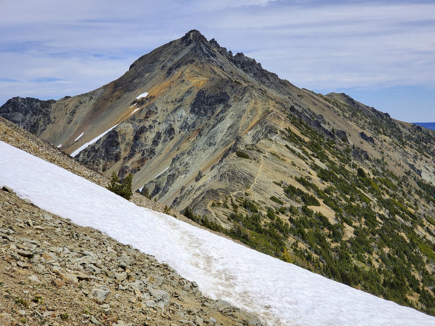 There are several creek crossings almost up to the ridge line, so you shouldn't lack for water (filter it, of course). If you take the corkscrew route up the summit block, a snowfield above the small basin on the north side produces a melt-water stream that was just deep enough to pump.