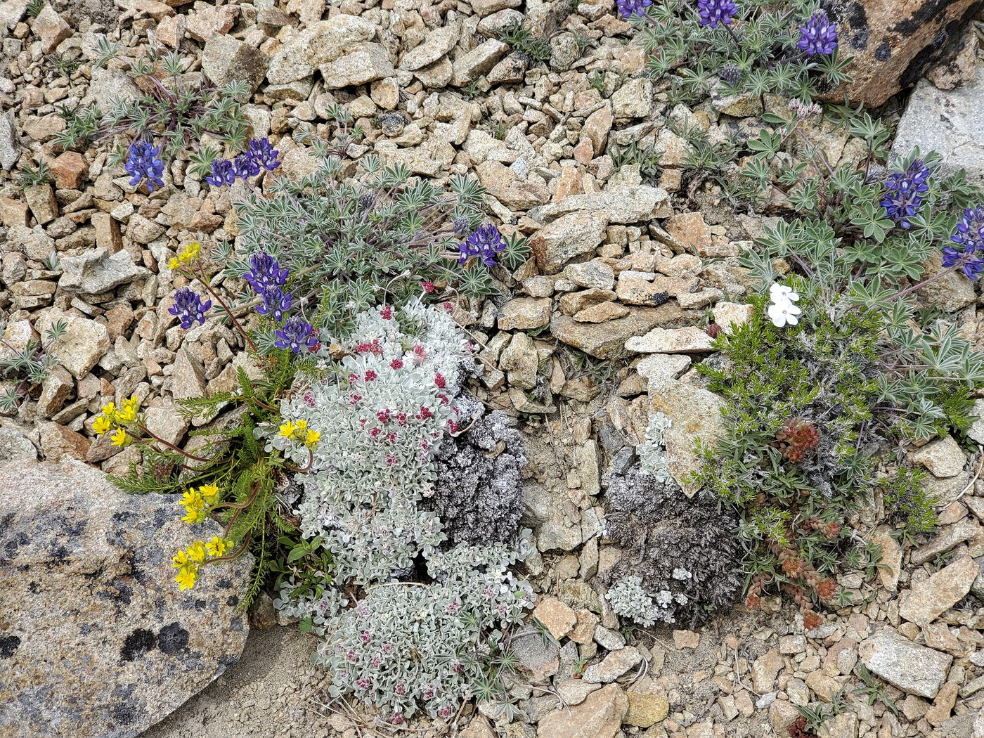 As the WTA description mentions, the first mile climbs fairly gently along an often rocky and dusty tread. The second mile is typical deep forest and continuously steep - it served notice that my pandemic cardio "regimen" has been, uh, lacking. This section also had a couple of substantial fallen trees that you can either clamber over or take steep detours around. After that, the grade moderates and the forest thins out, offering intermittent views of Mt. Rainier to the northwest and Not-Mt.-Aix to the south, before you reach the ridge line and begin the traverse to the actual Mt. Aix. Small wildflowers add an occasional splash of color to the rocky ridge.