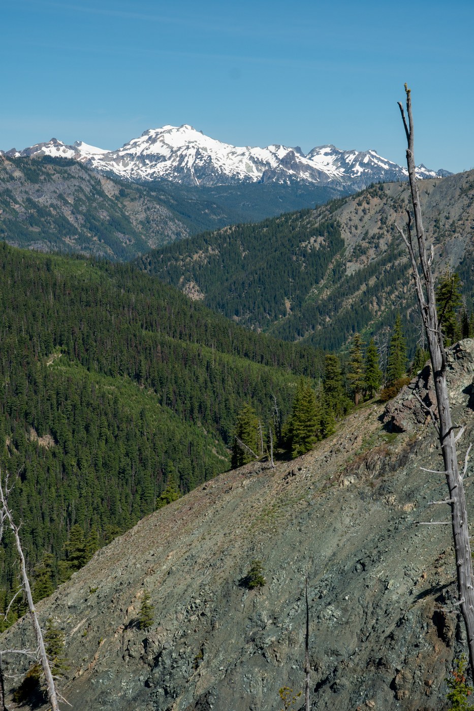 The next day, I packed up and headed toward Fortune Creek Pass which has a full-on view of Mt Daniel. From there, I kept climbing steeply, crossing a couple of snowfields, until I couldn't figure out where the trail was. I checked Gaia and saw that I was headed for the summit of an unnamed peak. When I backtracked, I could clearly see the trail I should have taken that descends from the pass. However, it is not so obvious when you are at the pass that the trail goes over the other side, so keep that in mind.