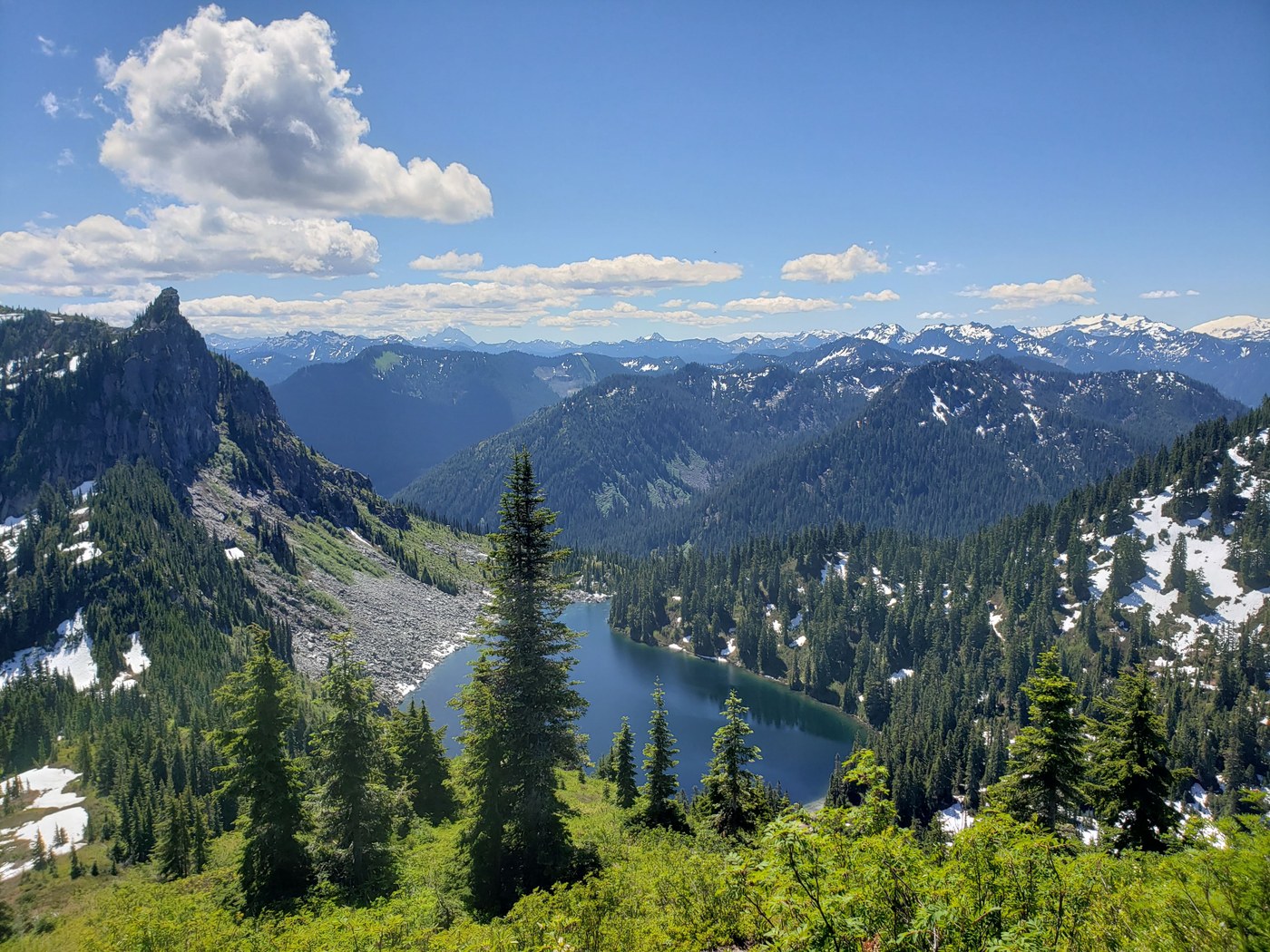 As for Mount McCausland, it was a great way to get away from all the day hikers at the lake. The trail up the mountain isn't marked, and currently its hard to see because the branch off from the Valhalla trail is covered in snow. Basically, the turn off to McCausland is right at the top of the ridge before you start going down to the lake. If you're hiking in the direction of the lake, it'll be on your right. Look for a snow field which will have our and a few other boot tracks on it. You should be able to see the trail just above the snow. There are a few snow fields across the trail, one or two that get slippery as the snow melts in the sun, but again passable without spikes or poles. Once you get past the snow, the trail is steep, but the views are worth it! You can see Rainier in the far distance on a clear day.