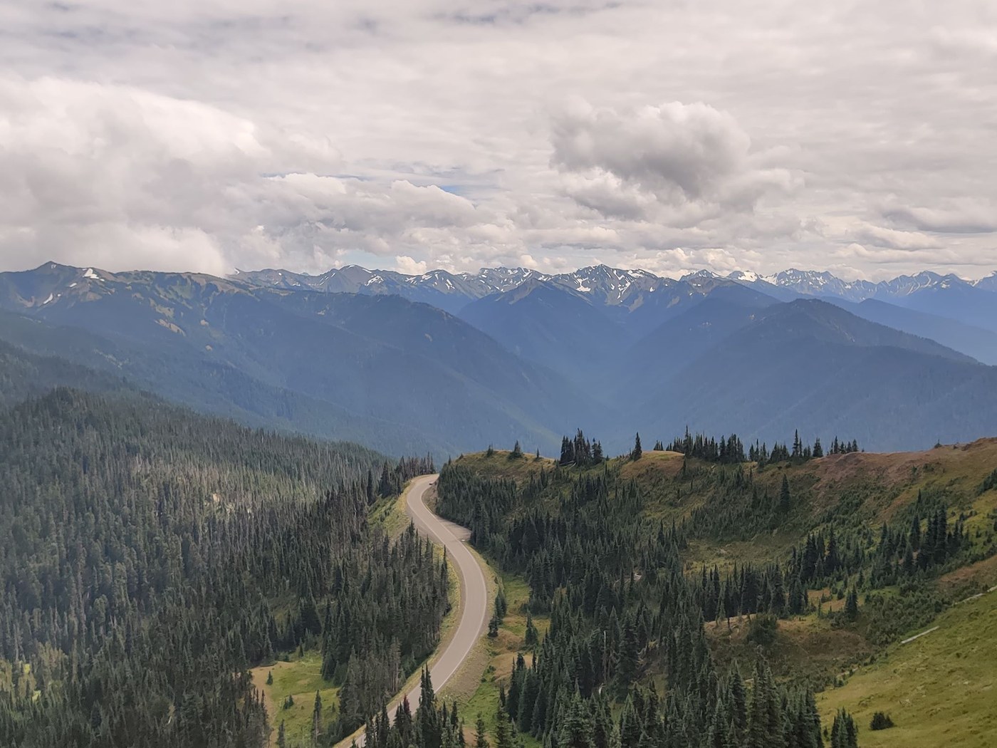 Continuing onto the Hurricane to Klahane Ridge connector, we followed the ridge watching the winding road below us drop lower. At the base of Mt Angeles, I turned left to check out the trail (not on all maps, but signposted). It winds through a few silent and foggy meadows before getting to some very loose scree. I couldn't find a notable trail past a few cairns in the meadow, and probs wouldn't have made it far without proper gear. Not wanting to add to the erosion, I made my way down and headed back to the parking lot.